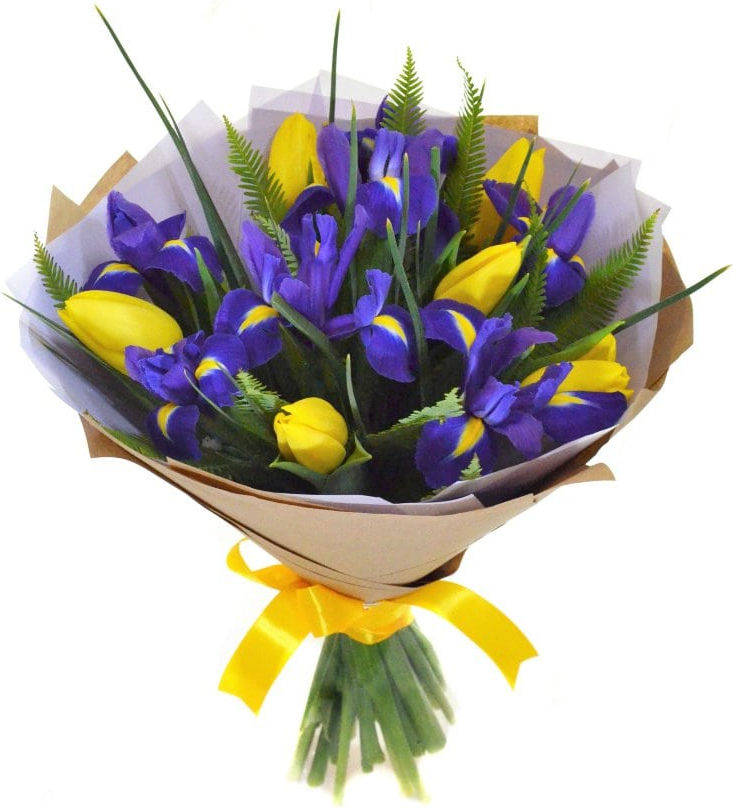 3 тюльпана, 4 ириса, зелень, упаковка, лента5 тюльпанов, 6 ирисов, зелень, упаковка, лента6 тюльпанов, 7 ирисов, зелень, упаковка, лента